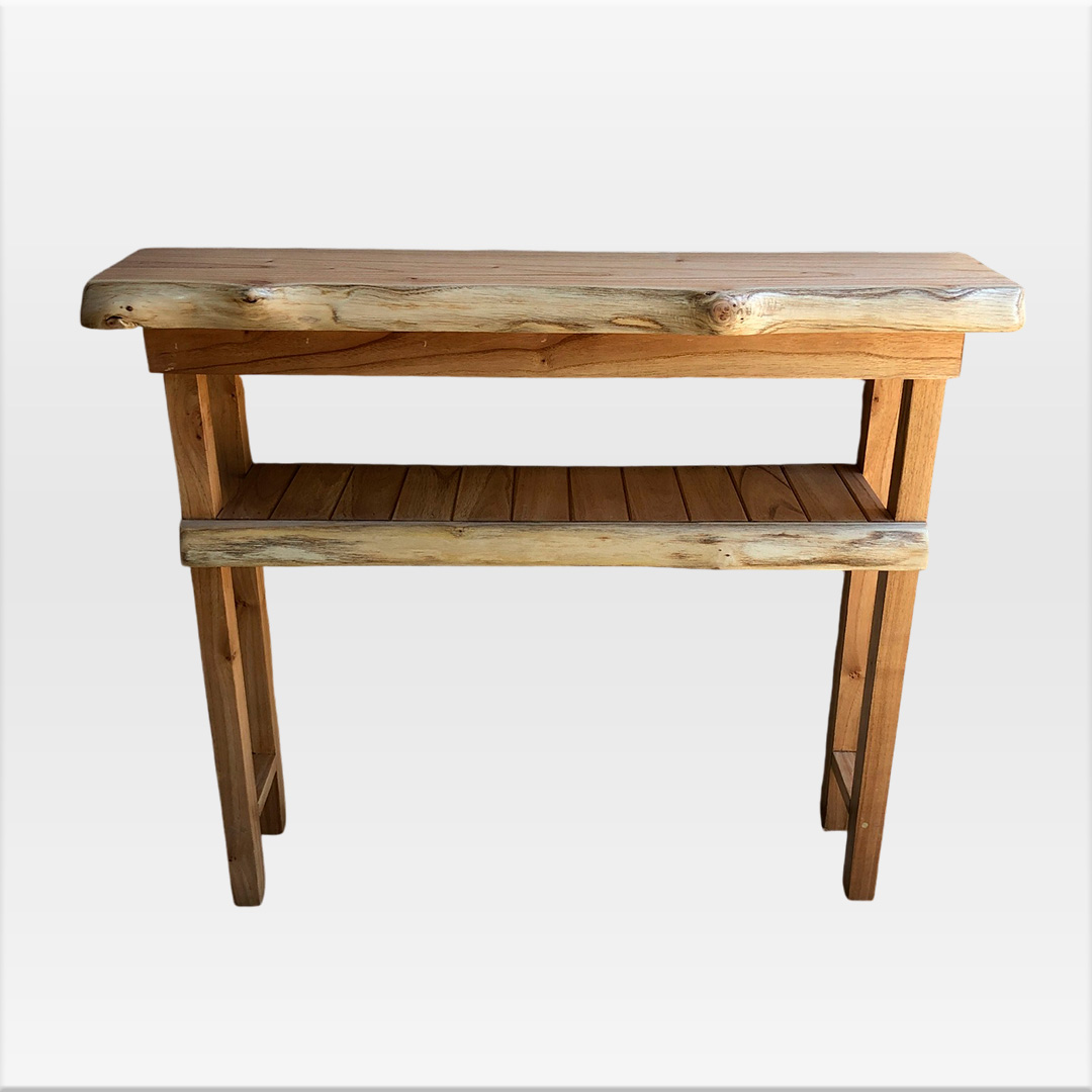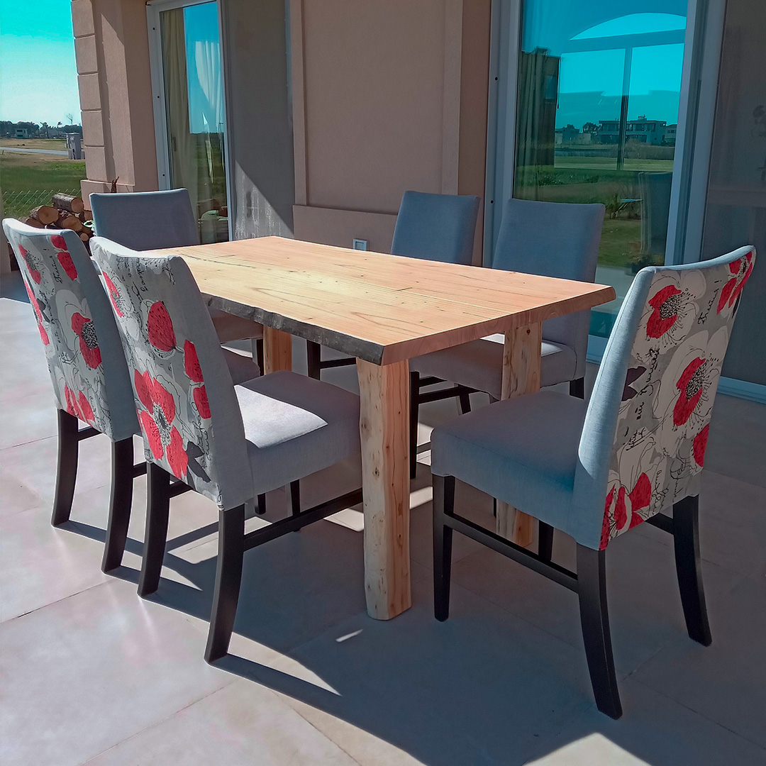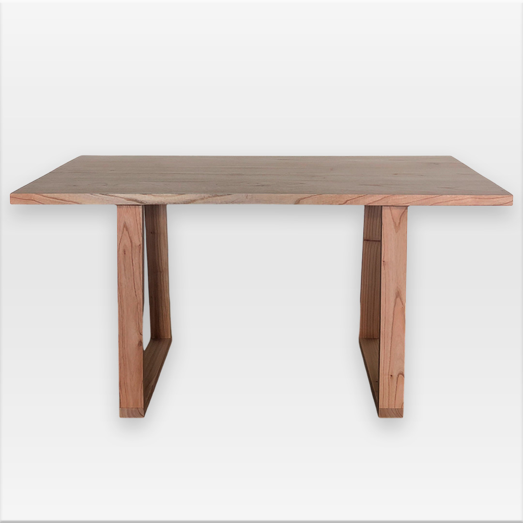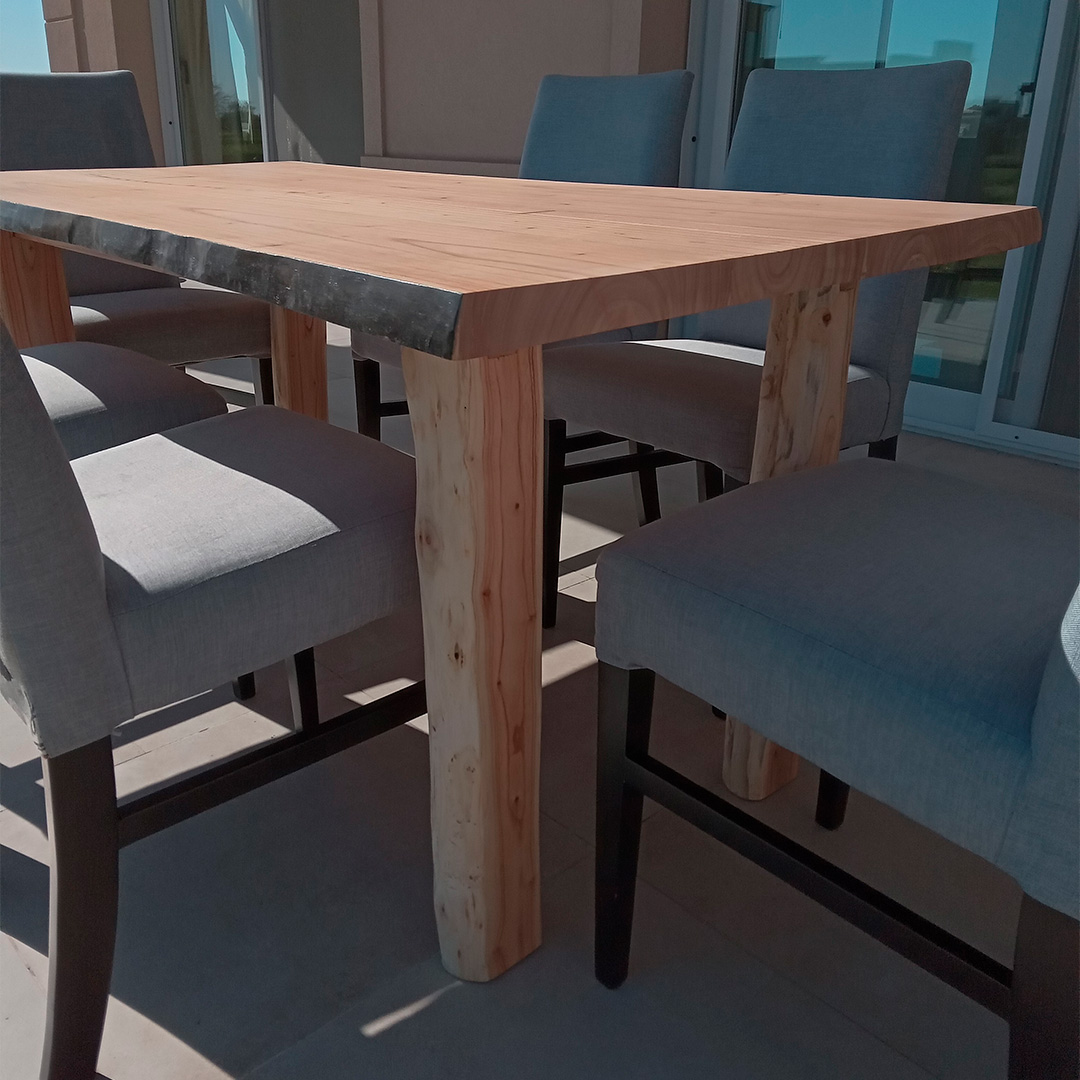 Tapa de madera maciza de paraíso. Bordes laterales rústicos en negro y cabeceras rectas al natural. Las patas son del mismo tronco, aportándole estilo rústico y robusto. Terminación con laca poliuretanica mate.